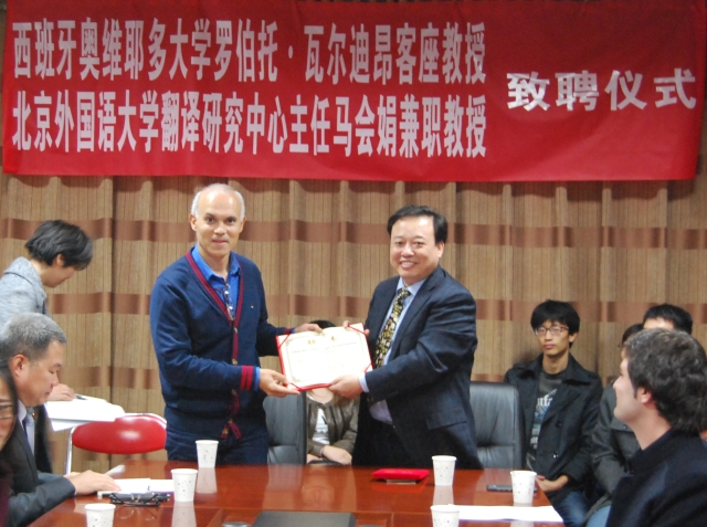 10月21日下午,伟德APP下载地址139会议室隆重举行了西班牙奥维耶多大学Roberto A. Valdeón(罗伯托·瓦尔迪昂)教授受聘为客座教授的致聘仪式。致聘仪式由院长助理马红旗教授主持。北京外国语大学博士生导师马会娟教授、学院院长、博士生导师阎国栋教授及翻译学研究中心主任、博士生导师苗菊教授出席。西班牙语专业3名外籍教师及全体师生、学院硕博研究生参加了此仪式。
