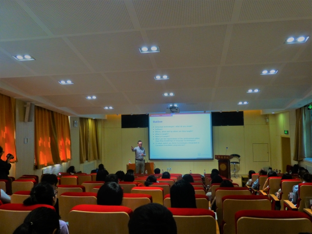 让·凯依永教授对此表示衷心感谢与热切期待,并于仪式结束后随即开始了题为《圆凿方枘?——翻译技术与加拿大译者培训》的学术讲座,从语言技术的内容、翻译辅助工具与相关软件的使用、翻译技术的教学内容、翻译技术的教学方法等方面对加拿大渥太华大学翻译学院的翻译技术教学进行了生动具体的介绍,引发了台下师生的强烈反响与积极互动,大家就术语抽取、翻译辅助工具及相关软件的使用及翻译毕业生就业去向等问题与凯依永教授展开了深入的探讨与交流,感慨良多,受益匪浅。
