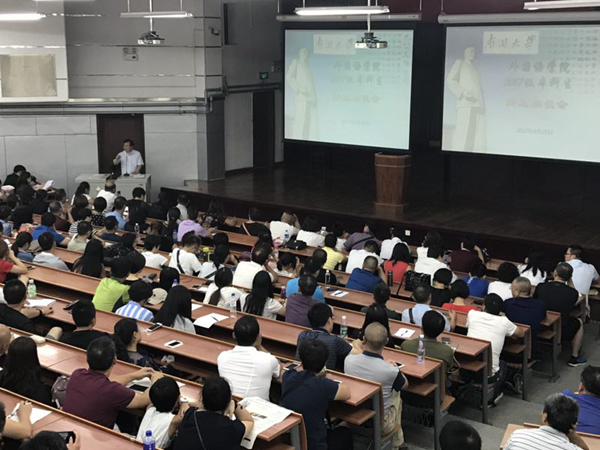 早在新生入学前,学院即通过“NK外院”微信公众号推送了各系主任对新生的寄语,迎新现场,“导师伴我行”之“系主任一席话”的大展板也更加耀目。寄语汇聚了导师对2017级新生的深厚希冀,而在专业介绍会上,专业教师面向学生家长进一步讲解学科实力、师资力量、学生培养等,让家长对孩子未来四年的学习成长有了直观了解。学生和家长纷纷表示,要“学做鲲鹏飞万里,不做燕雀恋子巢”,做到学有所成、业有所专、能有所长、心有所向。