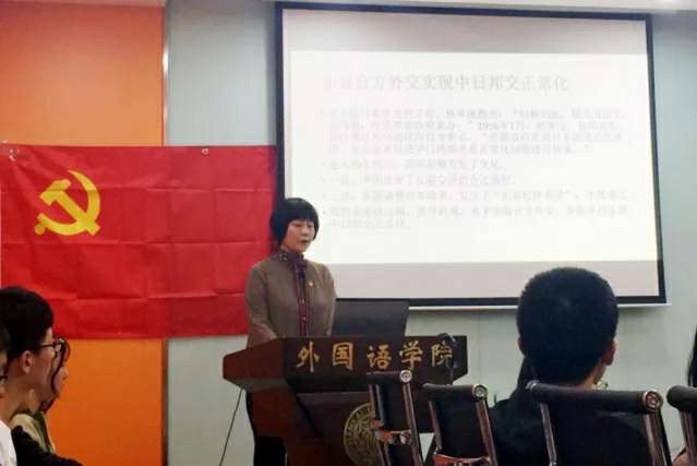 讲座伊始,韩立红教授以习近平总书记在纪念周恩来同志诞辰120周年座谈会上发表的重要讲话为背景,着重强调了此次座谈会的重要性和意义。随后分四个层次展开讲述,第一部分“周恩来,这是一个光辉的名字”,韩立红谈到周恩来总理的光辉一生,回忆起自己在学生时代对总理的瞻仰,她语重心长地说“学生时代,每当我在课本上读到有关周总理的故事,我便热泪盈眶, 为总理的崇高理想和远大抱负而深受感动”。第二部分“南开杰出校友周恩来-我是爱南开的”,在谈到周总理对南开的怀念和不舍时,韩立红专门向在座所有党员介绍了周总理在年轻时留学日本的特殊经历。周恩来十九岁赴日本留学行前,曾题“愿相会于中华腾飞世界时”,并赋诗言救国之大志:“大江歌罢掉头东,邃密群科济世穷,面壁十年图破壁,难酬蹈海亦英雄。”第三部分“周恩来与中日邦交正常化”是党课最核心的内容,韩立红介绍到新中国成立后,周恩来出任中华人民共和国总理。在恢复中日邦交正常化进程中做出了巨大的贡献。周恩来十分重视发展中日两国友好关系,在26年总理生涯中,为实现中日邦交正常化,整整操持了23年。第四部分“中日建交的意义”,韩立红指出中日邦交正常化集中体现了周恩来高超的外交水平和杰出的政治才华,有力促进了中日外交事业的发展,在国际上掀起了同中国建交的热潮。