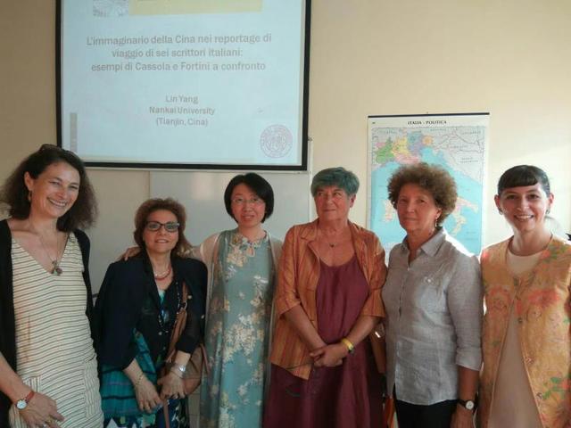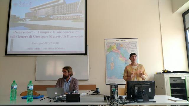 9月7日下午两位教师发言,引起听众的浓厚兴趣。杨琳的发言题目是“二十世纪下半叶六位意大利作家游记中的中国形象——以卡索拉(C. Cassola)与福尔蒂尼(F. Fortini)的比较为例”;乐小悦的发言题目为“‘我们’和‘他们’:朱塞佩·梅塞罗蒂·本韦努蒂(Giuseppe Messerotti Benvenuti)信件中的天津租界”。意大利著名汉学家西尔维娅·卡拉曼德雷伊(Silvia Calamandrei)女士、玛利亚·丽塔·马西(Maria Rita Masci)女士和安娜·第·托罗(Anna di Toro)教授专门到场聆听二人的发言、提问并点评,现场气氛热烈。杨琳所研究的卡索拉和福尔蒂尼是1955年意大利访华文化代表团中的作家,而当时的代表团团长正是西尔维娅·卡拉曼德雷伊女士的祖父、意大利著名法学家皮埃罗·卡拉曼德雷伊(Piero Calamandrei)先生,因此西尔维娅·卡拉曼德雷伊女士在讨论环节中补充的背景信息十分可贵。