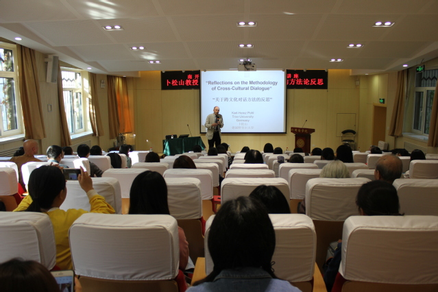 讲座上,卜松山教授从“文化”的概念入手,简单介绍了文化冰山模型和文化动力性特征,进而引出跨文化对话的内容。他认为,跨文化对话是理解他者的诠释学尝试,具有一定的方法和局限。依据数十年来从事汉学研究的经验,卜教授与听众分享了他对跨文化对话方法论上的十处思考,包括对话双方关系地位、语言、历史、种族中心主义等影响跨文化交流的因素和相似性陷阱、普遍主义等的思维误区。接着,他具体分析了西方基督文化和中国儒家文化的基本内容、特点、差异和共同之处,展示出跨文化对话的开展过程和优势之处。最后,卜教授特别强调了跨文化对话的开放性和平等性,有利于各国优势互补、共同丰富人类事业。