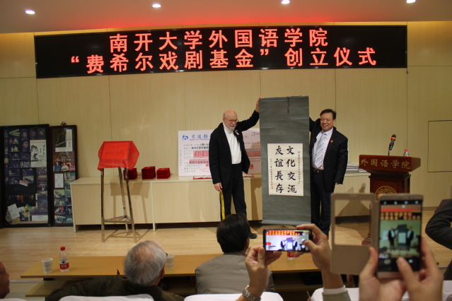费希尔向伟德APP下载地址捐赠老舍先生夫人胡絜青题字及《雷雨》《洋车夫(骆驼祥子)》外文戏剧表演的珍贵资料,向当年剧组成员赠送记录着戏剧表演的珍贵档案。费希尔谈到,非常荣幸在建校100周年之际回到伟德体育手机app下载,感谢各位基金捐赠者,希望南开戏剧在世界舞台中进一步发展。费希尔将他的中国学生看成他的孩子,他的学生用“good kind father”形容他,可见他与学生的深情厚谊。