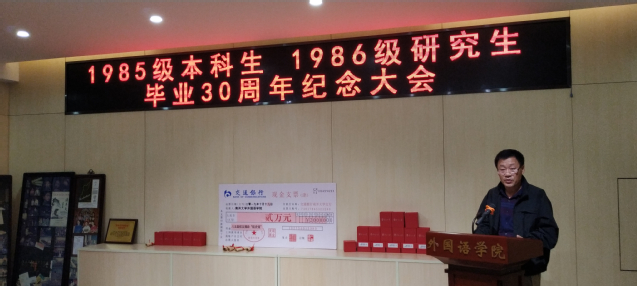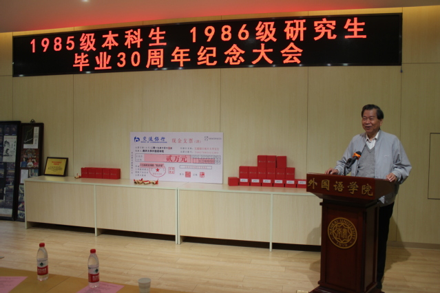 老教师代表常耀信、刘桂敏及英语专业校友谢哲强、日语专业校友岳忠科先后发言,共叙师生情、同学情、母校情。全体校友满含深情地向老教师赠送了百年校庆纪念品,表达了浓浓的感念师恩之情。