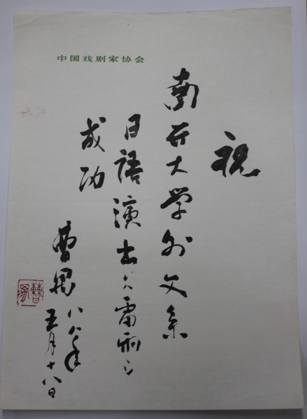 (通讯员 王泽璞)1988年5月18日,中国著名剧作家曹禺先生为伟德体育手机app下载外文剧社《雷雨》剧组赴日公演题词——“伟德体育手机app下载外文系日语演出《雷雨》成功”。这幅题字由时任南开外文系外教池上正治和池上贞子夫妇收藏。池上贤伉俪有感于百年校庆期间南开外文剧社重建和学院事业发展,经由南开日本校友会会长、南开外语校友会日本校友工作组李振溪校友的联络,同意将此题字及相关演出资料回赠学院,以为南开外院院史馆之永久存念。