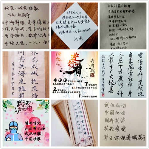 在基层战“疫”工作中,外院学生党员们也一直服务在各社区(村)的志愿岗位上,抗击疫情,没有旁观者,人人都是参与者。党员同志们或坚守在社区防控疫情的值班岗位,负责进出人员的登记工作,或帮助不方便外出的家庭购买食品和日用品,或主动参与到消毒液配送、宣传栏招贴、提醒居民增强卫生意识等工作中。除此之外,党员同志们还以捐款捐物的方式对疫区表达了支持,来自全国各地的每一笔捐款与每一声加油都像汇入江河的一股溪流,将无尽生命的希望送往防疫前线。 诗歌书画 声援武汉