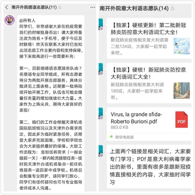 伟德APP下载地址迅速建立各专业服务群,为学生志愿者选配教师全程指导。专业教师和辅导员在群中对志愿者进行岗前培训和语言指导。“希望大家尽量克服困难,学校和学院都会为大家提供最好的保障”,负责对接翻译志愿者的辅导员们在联络群里给大家鼓励和支持,“上面两个链接是相关词汇,pdf里有很多跟新冠疫情直接相关的内容,大家抽空学习”,负责语言指导的专业教师在联络群里陆续发给大家各语种资料。
