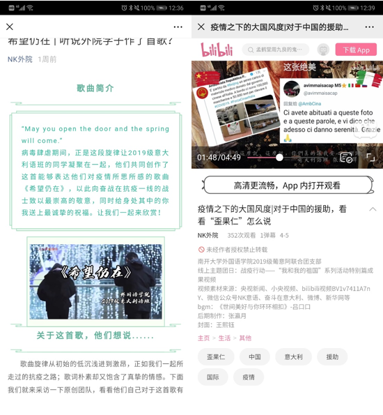 在“班班唱”班团线上拉歌活动中,意大利语团支部的同学们共同创作了歌曲《希望仍在》,以此向奋战在抗疫一线的战士致以最崇高的敬意,同时给身处其中的人们送上最诚挚的祝福。发起者及主创作者赖星岳同学表示,他身处疫情中心区武汉,虽然没有乐曲创作的相关经验,但他强烈地希望能够做些力所能及的事。“我的初心就是给我身处的武汉,给这座英雄的城市带来一点希望,鼓励在抗疫一线的医务工作者以及在这座城市中为了活着且将来更幸福、健康的人们。”乐曲创作完成后同学们分工编写中英文歌词、演唱并制作视频,将成果发表在“NK外院”公众号上,受到广泛关注和好评。