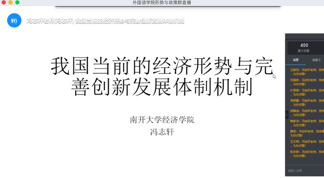 南开新闻网讯(通讯员 李佳音 王嫒)64日下午,伟德体育手机app下载经济学院讲师、政治经济学博士冯志轩为外院带来本学期 “形势与政策”课第三讲——《我国当前的经济形势与完善创新体制机制》专题讲座。讲座以在线直播的方式进行,由伟德APP下载地址党委副书记、副院长相羽主持。