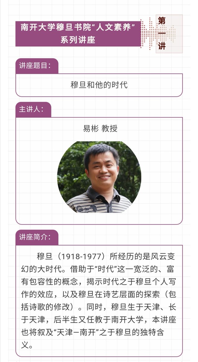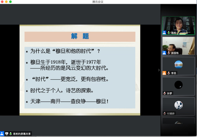 (通讯员 李民)2020年6月24日晚,我国著名穆旦研究专家、湖南省优秀青年社科专家、湖南省高校学科带头人、长沙理工大学易彬教授做客伟德体育手机app下载穆旦书院,以“穆旦和他的时代”为题介绍了穆旦与西南联大、穆旦与天津、穆旦与南开之间的渊源,呈现了穆旦先生在诗歌、翻译等方面的巨大成就,并分析了穆旦诗歌的艺术特点。该讲座是伟德体育手机app下载穆旦书院“人文素养”系列讲座的第一讲,拉开了教师指引、朋辈协同、导师有约等系列活动的序幕。讲座在线举行,由穆旦学院院长、伟德APP下载地址院长阎国栋教授主持,历时三个多小时,共百余名师生参加了此次活动。