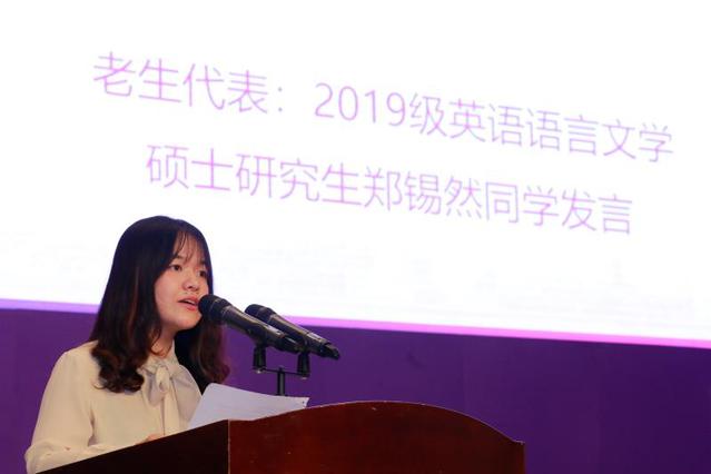 研究生会执行主席、优秀公能朋辈导师、2019级英语语言文学专业硕士郑锡然代表老生发言,她从自己的经历入手,强调学习南开精神、感受语言魅力、积极探索实践,强调“Language is power”。倡议2020级新生秉持“公能”意志,感受外语力量,突破知识边界,做复合型外语人才,做南开精神传承者。