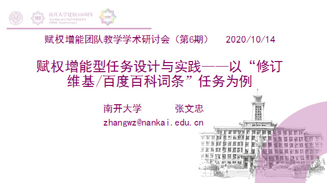 随后,张文忠教授为与会老师奉献了一场精彩的将“赋权增能”理念付诸教学实践的汇报。该报告题为“赋权增能型任务设计与实践——以‘修订维基/百度百科词条任务’为例”,介绍了在伟德体育手机app下载英语专业平台型课程“个性化英语学习”课程中多次实施,并推广到四川大学与曲靖师范学院的一项教学任务的设计、实施及教学效果。张老师的报告详细、清晰,对理论的阐释深入浅出,使与会教师既加深了对“赋权增能”教学理念的理解,又获得了宝贵的教学任务设计与实施的指导。