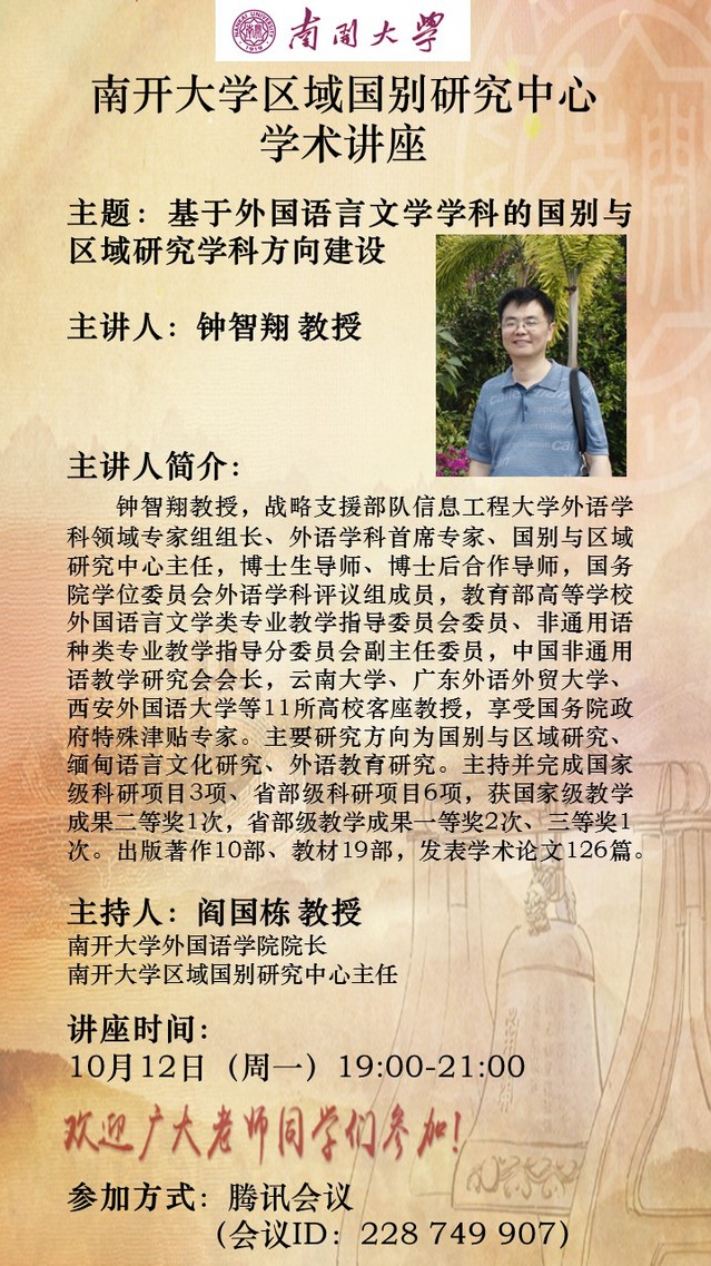 (通讯员 曹熙铭 杨琳)10月12日晚,中国非通用语教学研究会会长、国务院学位委员会外语学科评议组成员、教育部外指委非通用语分委会副主任委员、国务院政府特殊津贴专家、博士生导师、信息工程大学的钟智翔教授做客伟德体育手机app下载区域国别研究中心,带来题为“基于外语学科的国别与区域研究学科建设及人才培养”的学术讲座。讲座在线上举行,由伟德betvlctor1946体育院长、伟德体育手机app下载区域国别研究中心主任阎国栋教授主持。来自伟德体育手机app下载和全国其他院校的一百五十余名师生积极参与了本次讲座。