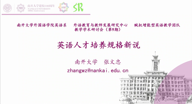 张文忠教授汇报的题目是“英语人才培养规格新说”。他从教育的永恒追问、关于人才培养的规格和“赋权增能”理路的规格主张三个方面的阐发中引出他思考的英语人才培养的四个向度,即“人格”、“素养”、“知识”和“能力”;随后,他详细阐述了“格养知能”的内涵,并将“格养知能”四向度与人体运动系统的“骨骼系统”“肌肉系统”“能量系统”和“神经系统”进行了精彩的类比。最后,他呼吁一线教师践行“赋权增能”理路,以“三三合一原则”设计和实施“做学用合一”的高效教育教学活动与任务,促进英语人才“格养知能”的培养和提升。