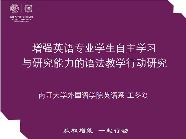 王冬焱博士以“增强英语专业学生自主学习与研究能力的语法教学行动研究”为题,从研究背景、研究问题、措施与方案和评价与反思四个方面汇报了她应用“赋权增能”理路,在英语专业低年级学生中进行英语语法教学的两轮行动研究。她报告的行动研究证实,在英语专业低年级学生中进行专门语法教学符合学生需求,引导学生在语法学习中开展课外自主学习行之有效,组织学生针对语法项目开展小组项目研究切实可行。