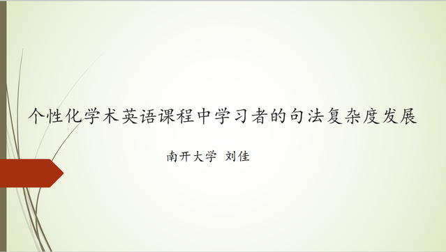 第一位汇报人刘佳的汇报题目为“个性化学术英语课程中学习者的句法复杂度发展”。刘佳详尽解读了研究选题背景、相关理论、研究问题及对象、研究设计、数据收集过程、研究结果和讨论。其研究表明秉承赋权增能理念的个性化学术英语课程对学习者学术写作能力及其写作句法复杂度发展的积极影响。