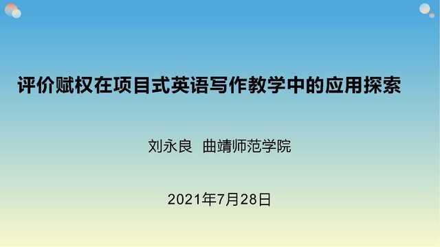 刘永良老师的汇报题目为《评价赋权在项目式英语写作教学中的应用探索》。在汇报中,他详细阐述了该课题的研究背景、文献基础、理论框架、研究设计、数据收集与分析、结果与讨论及研究启示。