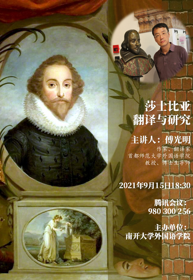 (通讯员 贺佳)2021年9月15日,首都师范大学教授、博士生导师傅光明教授为伟德betvlctor1946体育师生带来精彩的线上学术讲座“莎士比亚翻译与研究”。