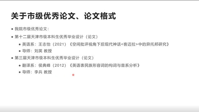 会议的第三个环节,学院邀请了英语专业论文负责人、第三届天津市级本科生优秀毕业论文(设计)获评者侯典峰就英语专业2022届毕业论文管理概况和我院两篇市级优秀论文的写作经验进行分享。侯老师首先提出在进行论文管理工作时,要注重五个关键点:严格的流程管理,合理的节点设置,全过程跟踪答疑,多环节审核把关以及紧盯关键问题。在分享市级优秀论文的写作经验时,侯老师谈到了两点:一是在论文选题上做到具有理论性、创新性并且标题的拟定要吸引人。二是强调了论文内部格式的规范统一。