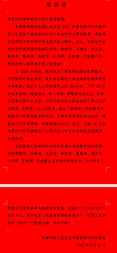 活动得到了杨家峪村村委会及群众们的充分肯定,云支教结束后,村委会专门给学院发来感谢信,赞扬同学们的辛勤付出。信中提到:“从2020年开始,我村成为了贵院的劳动教育基地。本次同学们每次上午150分钟、下午150位孩子们精心准备课件、耐心讲授,课程设计文化、体育、英语等内容,不仅对我村幼小学生进行了课内知识的辅导,还拓宽了他们的眼界。通过了解伟德体育手机app下载的校史,增强了孩子们对高校教育的向往。总之,为期十四天的辅导对于我村孩子们来说真是受益匪浅、收获颇多。”