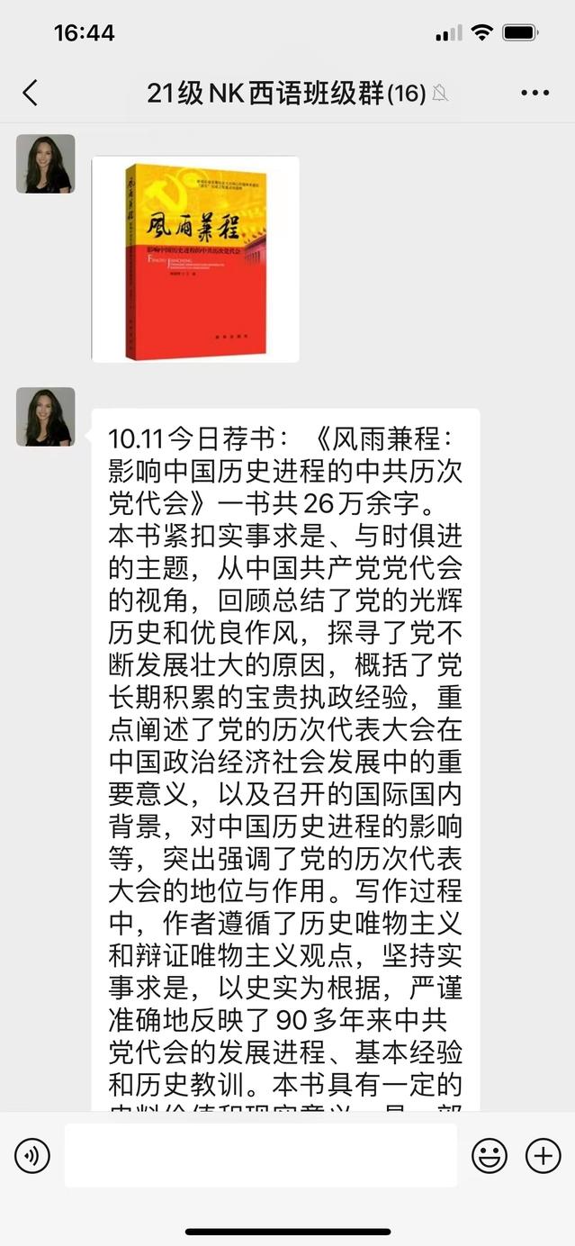 涵育师生阅读风尚,不断促进师生在阅读中增长智慧,在阅读中陶冶情操。西班牙语系李玮琦老师与学生共读《风雨兼程》一书,该书将影响中国历史进程的历次党代会总结为旭日东升、艰苦岁月、我主沉浮、治国理政、曲折探索、开辟新路、击舸中流、全面小康和科学发展的若干主题,回顾总结了党的光辉历史和优良作风,探寻了党不断发展壮大的原因,概括了党长期积累的宝贵的执政经验。本书的写作坚持实事求是,严谨准确地反映了一大至十七大党代会的发展进程、基本经验和历史教训。阅读该书可帮助师生了解史实并深入理解党的历次代表大会在中国政治经济社会发展中的重要意义,是一部可读性强的读物。