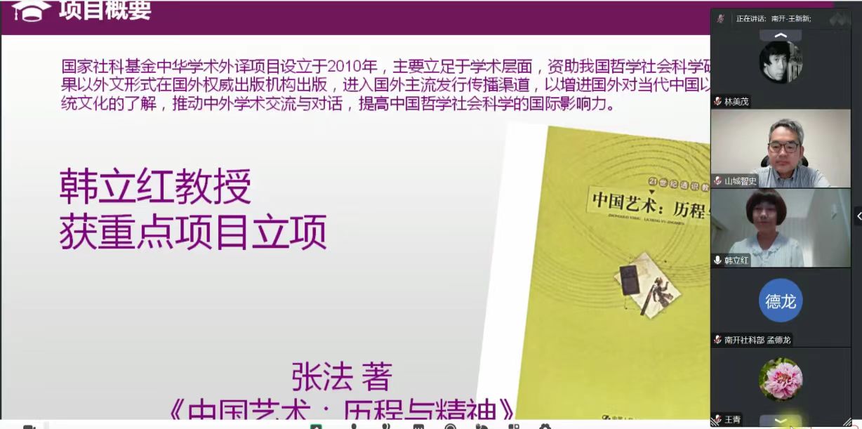 (通讯员 韩立红)2023年7月17日,2022-2023年度国家社科基金中华学术外译重点项目《中国艺术》(张法著)开题报告会在线上举行。该项目(日文版)由伟德betvlctor1946体育日语系主任韩立红教授与中国人民大学出版社联合申报,韩立红教授为项目主持人。