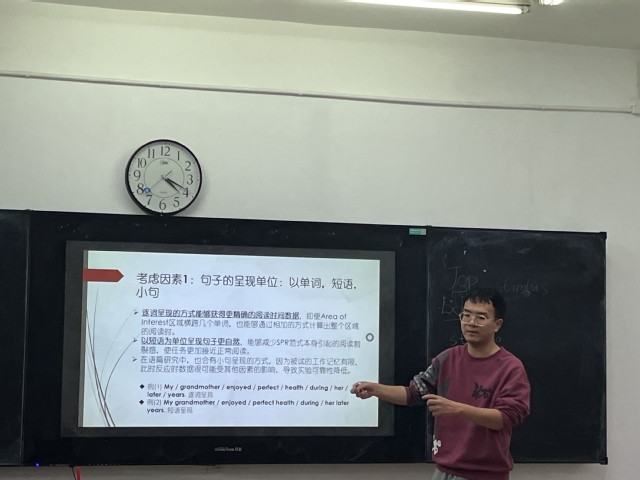 外国语言学及应用语言学专业硕士研究生郝俊杰做了题为“E-prime心理语言学入门”的分享活动。首先,郝俊杰同学讲解了为什么要开展语言加工研究以及语言加工研究的常见研究工具。之后,郝俊杰同学以词汇判断任务为例对E-prime实验编程进行了讲解,同时分享了自定步速阅读实验范式的设计思路和注意要点。