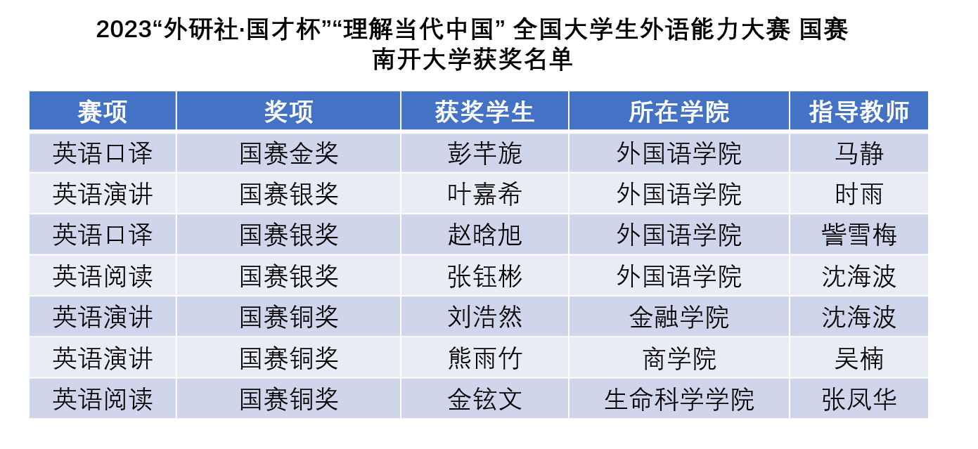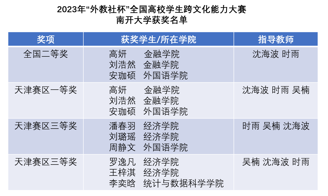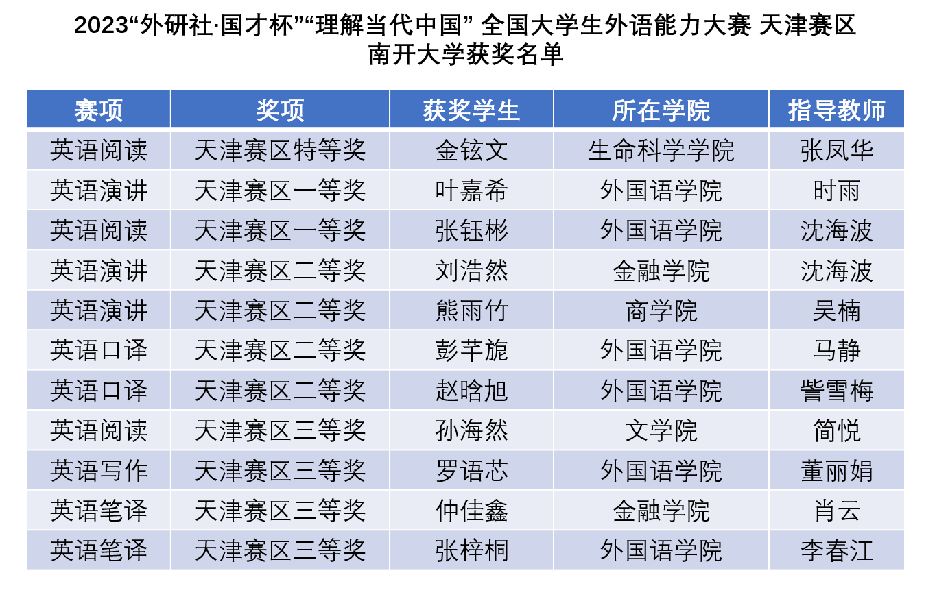 (通讯员时雨 唐磊)12月初,2023“外研社.国才杯”“理解当代中国”全国大学生外语能力大赛(简称为“外研社国才杯”外语能力大赛)和2023年“外教社杯”全国高校学生跨文化能力大赛(简称为“外教社杯”跨文化能力大赛)两大英语赛事圆满落幕。我校选手今年的参赛成绩创我校参与两项赛事以来最佳成绩,展现了南开学子的风采。
