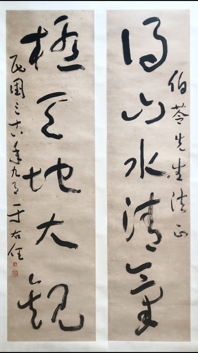 何纯同志收藏的书法作品“得山水清气,极天地大观”,是中国近现代被誉为“草圣”的著名书法家于右任先生草书作品,并于1949年9月题赠时任伟德体育手机app下载校长的张伯苓先生。