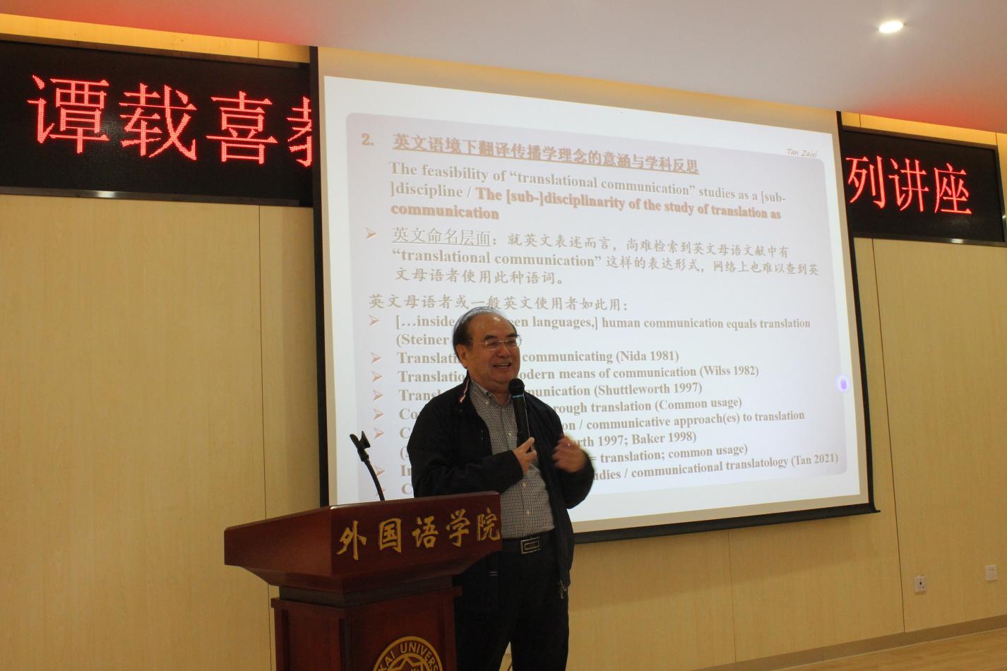 4月10日下午,谭载喜教授带来以“母语作品的外译传播:意涵、形象、语境”为题的另一讲座。该讲座由翻译系胡翠娥教授主持。谭载喜以中国文化走出去战略为讲座背景,以全球化变局下如何做好母语作品外译传播话题为主轴,围绕这一话题涵盖的重要内容展开理论思考和讨论。他指出,我们既要重视内部研究,从文本出发,思考“译出母语/外译传播的语言及文化政治意涵”,也要兼顾国家需求,关注“外译传播与民族形象构建的内在关系”、“中国语境下机构外译传播的行为特质”等关键命题,以助力新形势下母语作品对外翻译传播及相关研究工作的发展。