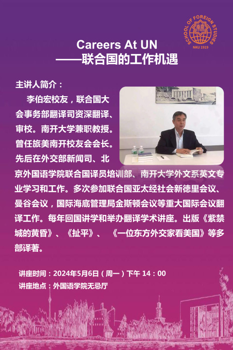 李伯宏校友先后在外交部新闻司、北京伟德APP下载地址联合国译员培训部、伟德体育手机app下载外文系英文专业学习和工作。多次参加联合国亚太经社会新德里会议、曼谷会议、国际海底管理局金斯顿会议等重大国际会议翻译工作。结合自身三十多年的翻译工作经验,李伯宏先生以“Careers At UN——联合国的工作机遇”为主题,从联合国、联合国翻译以及翻译的艺术等方面进行讲解。讲座伊始,李伯宏从签订《联合国宪章》、联合国主要机关、官方语言等方面介绍了联合国的历史概况和结构,并强调了在联合国中翻译工作连接全球、沟通世界的重要作用。随后主要讲解了联合国中的就业机会,其中着重对联合国中青年的就业机会进行了介绍。他强调,对于外语学子而言,联合国中的就业机遇众多,并对联合国青年专业人员考试(YPP),联合国工作相关实习招聘路径、报名通道等进行了详细讲解,鼓励大家把握机会、培养自信心,积极参与联合国实习和工作。