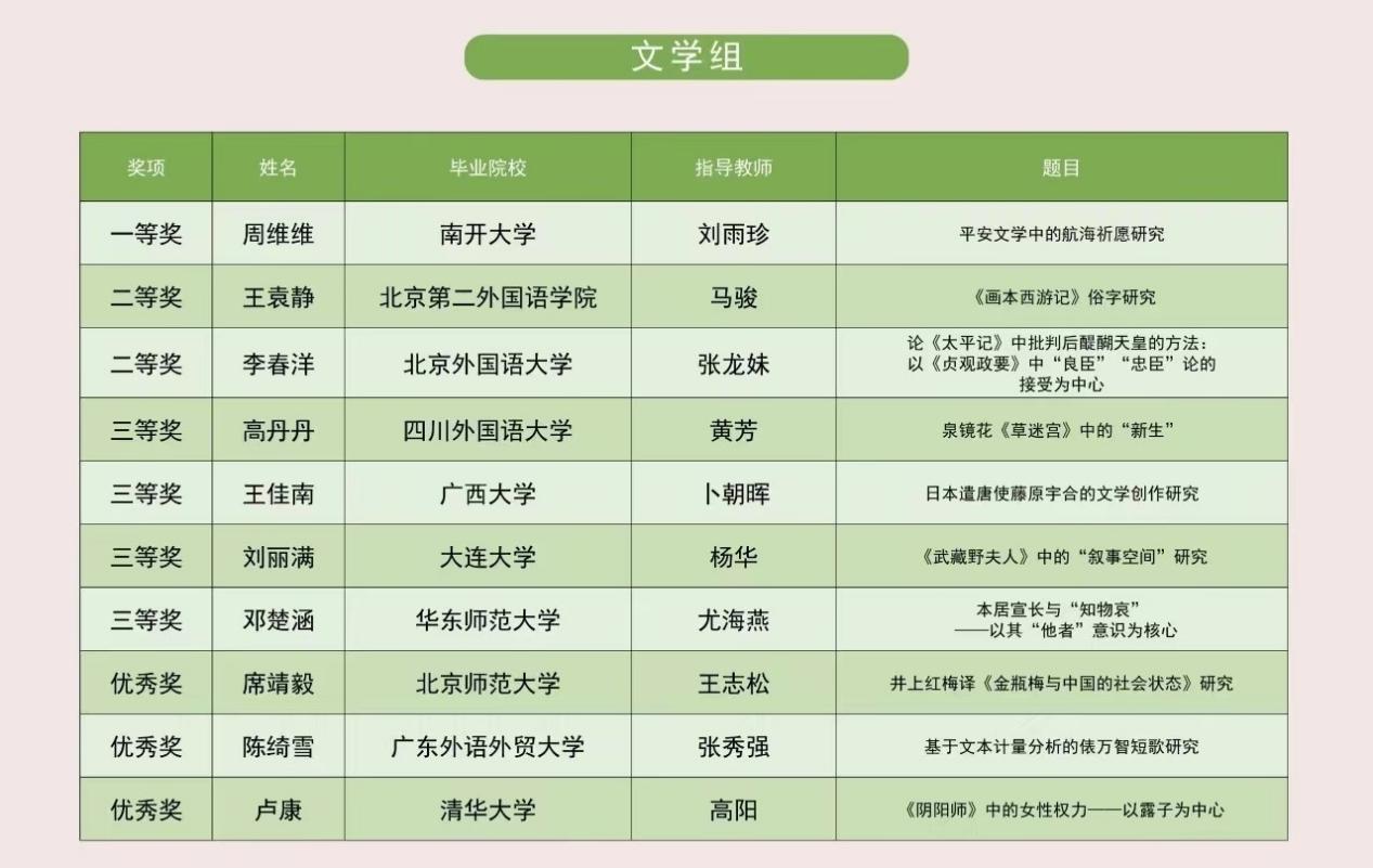 (通讯员 周维维 刘雨珍)5月11日下午,由北京外国语大学北京日本学研究中心、中国日语教学研究会主办,卡西欧(中国)贸易有限公司协办的第十六届中国日本学研究“卡西欧杯”优秀硕士论文颁奖典礼活动在北京日本学研究中心以线上线下相结合的方式顺利举行。日语语言文学专业2020级硕士生、现日语语言文学专业2023级博士生周维维同学的硕士论文《平安文学中的航海祈愿研究》获得文学组一等奖,指导教师刘雨珍教授获得优秀指导教师奖。