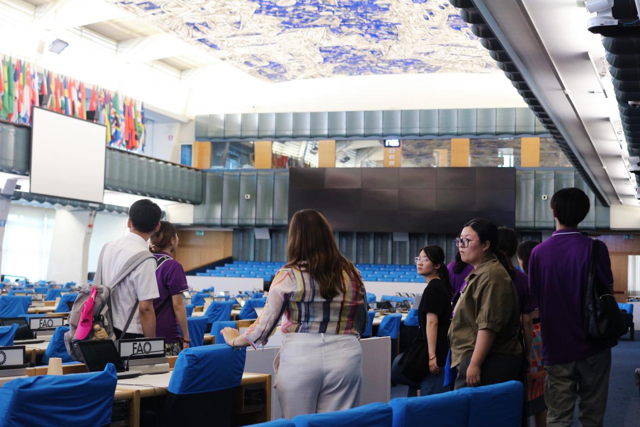 除对粮农组织的历史沿革、组织体系、建设成就等有了全面的了解外,师生们还参观了总部会议室,各会场的配色与意大利国旗的红、白、绿三色以及粮农组织旗帜的天蓝色相呼应,设计独特,配套设施完善。师生们还了解到,总部内随处可见的艺术品来自各国的捐赠,这些作品体现了各国对解决粮食与农业问题、提升生活水平的愿景。
