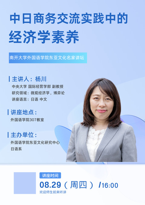 (通讯员 王凯)8月29日,中央大学国际经营学部杨川副教授来访,并为日语系师生和在校日本留学生举办题为“中日商务交流实践中的经济学素养”的学术讲座。