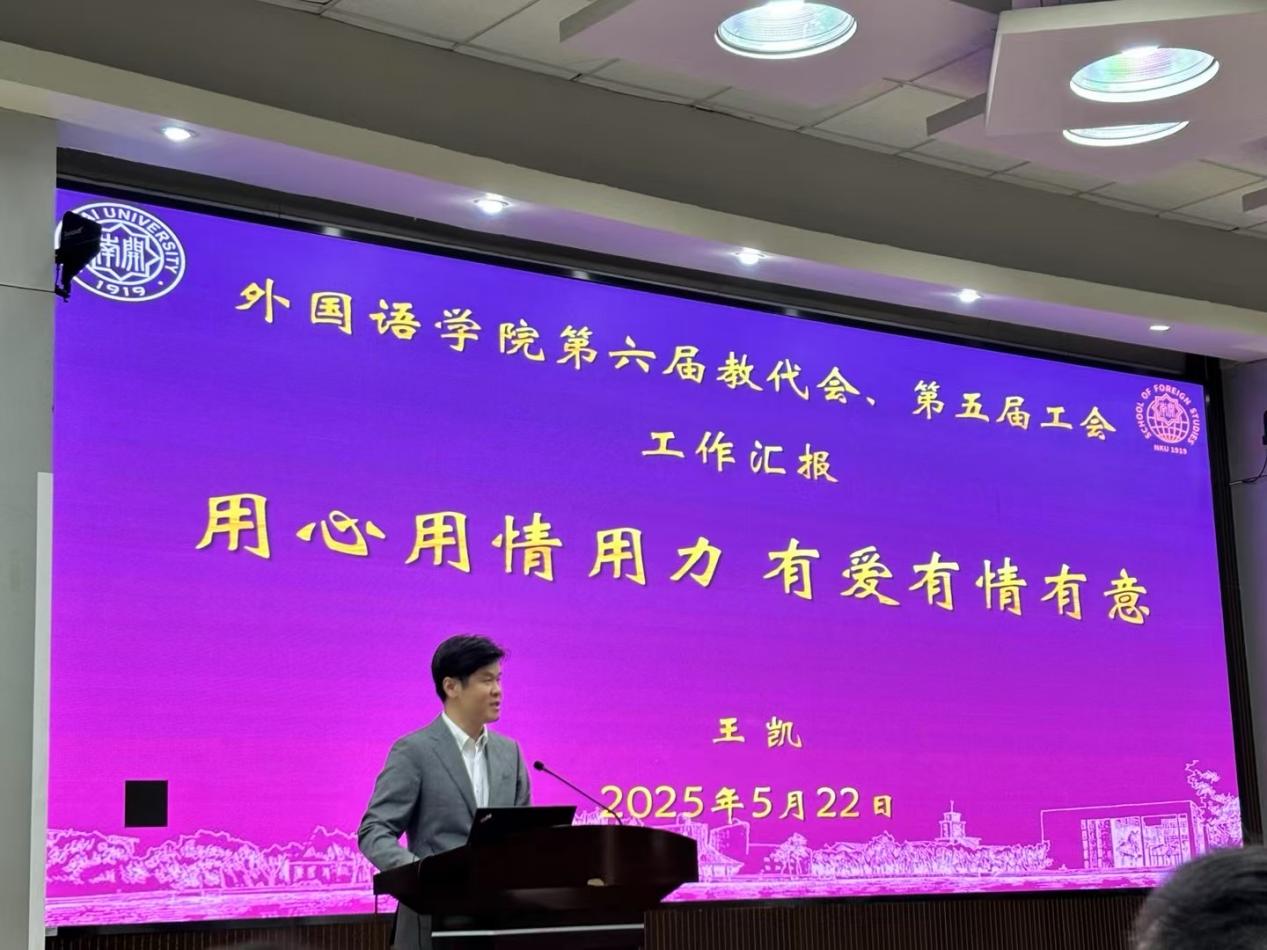 伟德APP下载地址工会主席王凯受邀在大会上分享了伟德APP下载地址工会、教代会的工作经验。王凯指出,伟德APP下载地址工会紧密围绕总书记重要讲话精神,结合学校高质量发展改革攻坚“十大行动计划”,从“高质量党建引领”“用心用情用力服务”“教书育人立德树人”“增进国际友谊”四个方面开展工作。近一年来,学院工会举办了约20场丰富多彩的活动,涵盖教学交流、文体活动、技能培训等,累计惠及教职工约500人次,力求为教职工提供贴心服务,让每位教职工成为自豪的外院人、幸福的南开人。